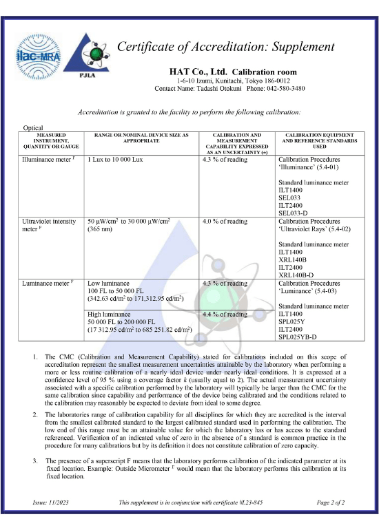照度計、紫外線強度計、輝度計についてISOの認証を受けており、高い基準で校正を行います。(ISO/IEC 17025 認定)